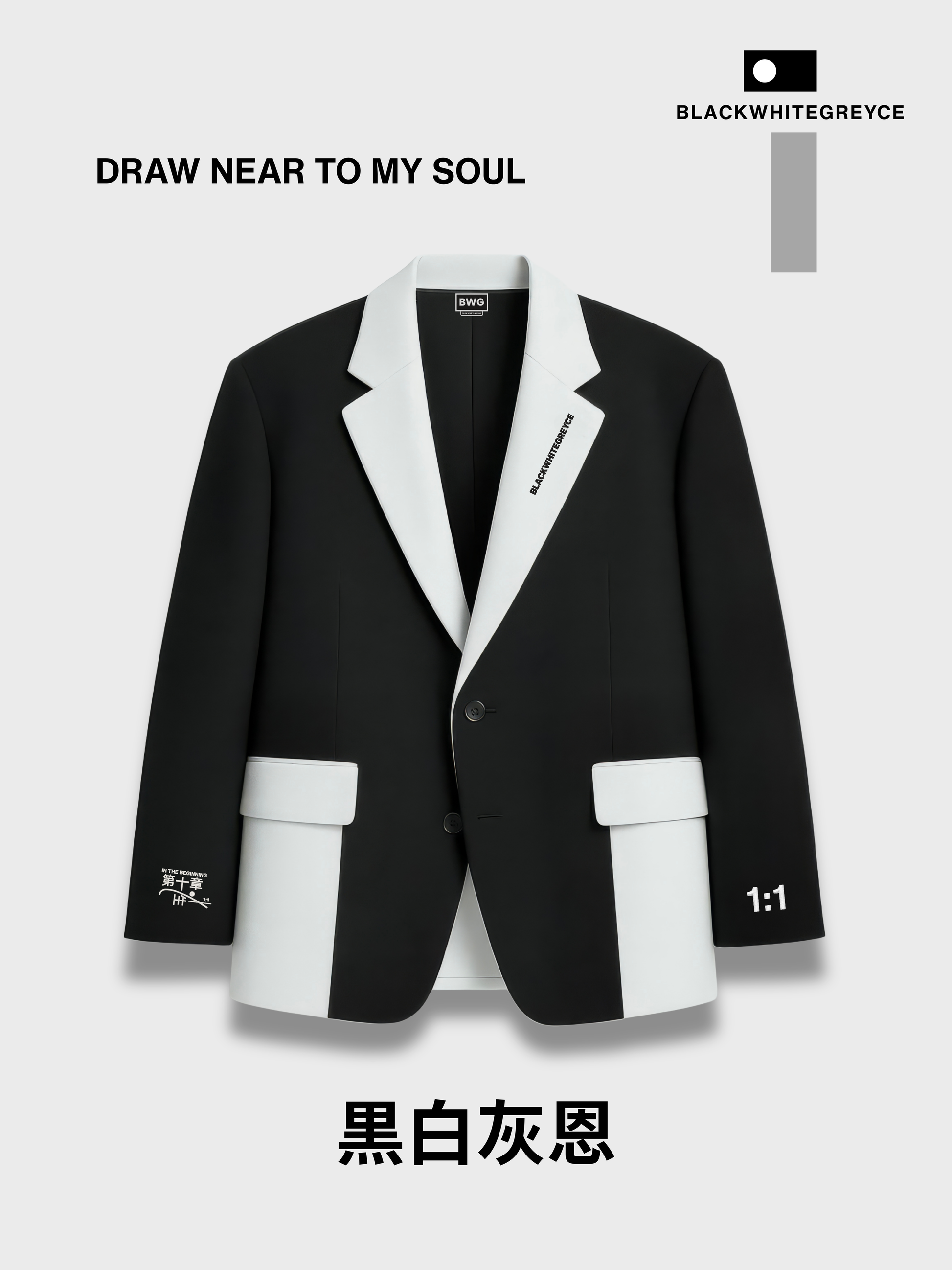 - Front: Embroidered BLACKWHITEGREYCE along the right lapel in clean satin-stitch. On the sleeve, the mark 1:1 stands opposite IN THE BEGINNING rendered in Japanese embroidery — the intersection of origin and unity.