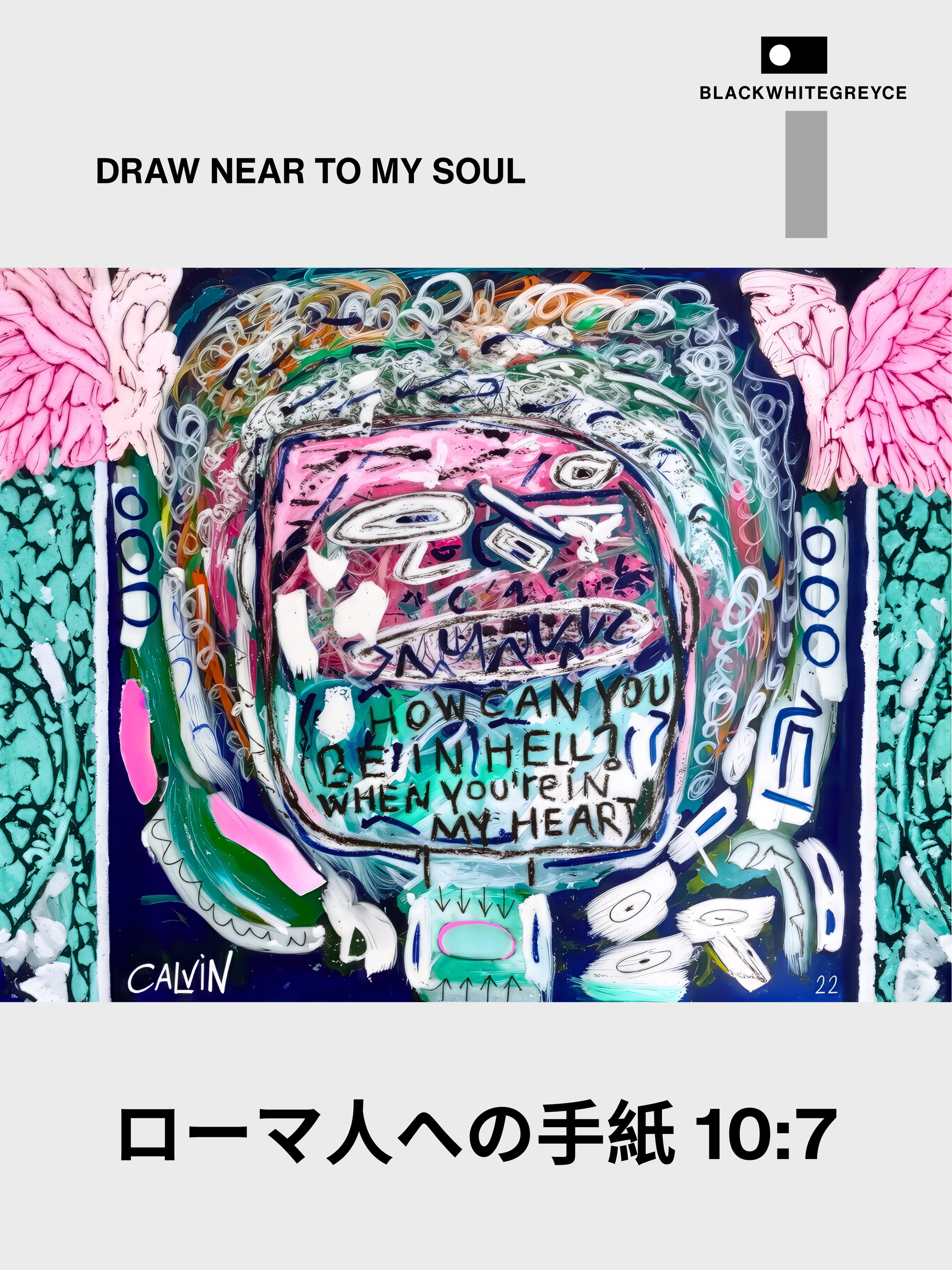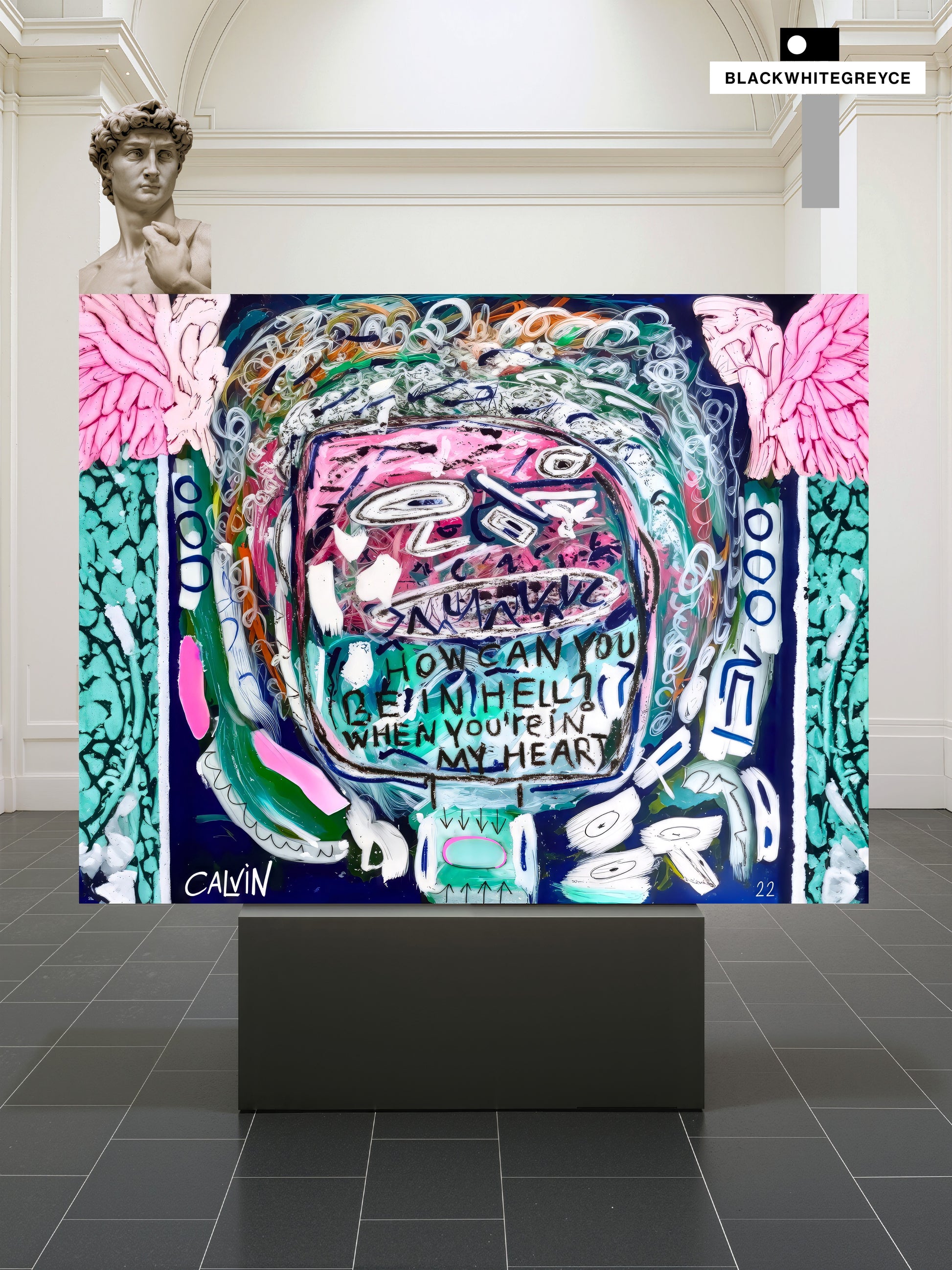 In Romans 10:7, CALVIN transforms scripture into a visceral dialogue between heaven and descent — between spiritual longing and the human condition. The composition radiates with dense emotional architecture: swirling strokes of turquoise, rose, and alabaster collide in controlled chaos, surrounding a central form inscribed with the haunting phrase, “How can you be in hell when you’re in my heart?”