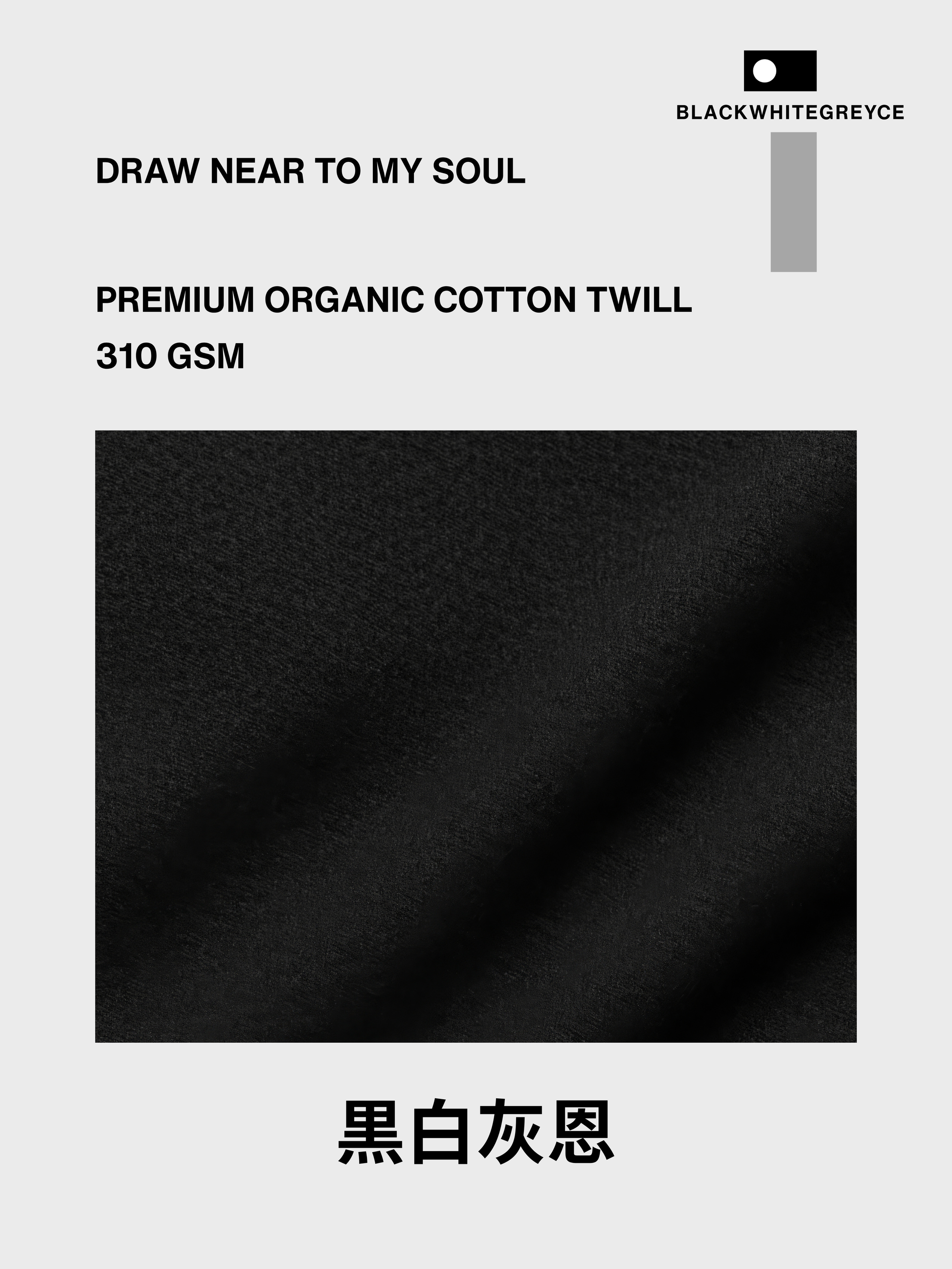 - Back: Embroidered composition featuring DRAW NEAR TO MY SOUL vertically aligned along the left leg. Accompanied by BWG’s emblematic symbols — 1:1, 無白灰恩, and the BWG mark — arranged with sacred precision.