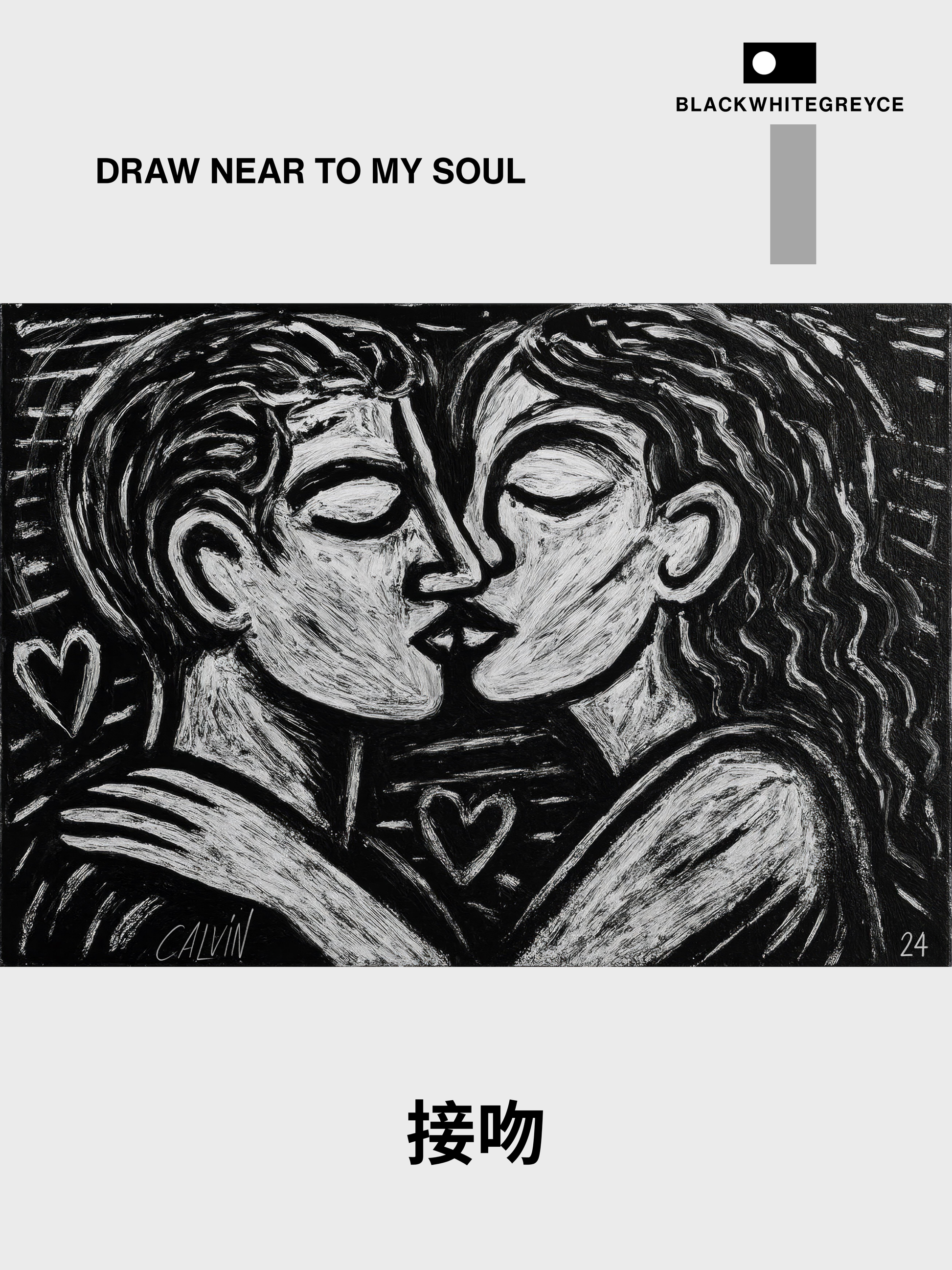 In The Kiss, CALVIN captures one of humanity’s most intimate gestures and transforms it into a timeless symbol of unity — a merging of form, breath, and spirit. Rendered in a restrained palette of black and white, the composition radiates raw simplicity, yet its emotional gravity is profound.