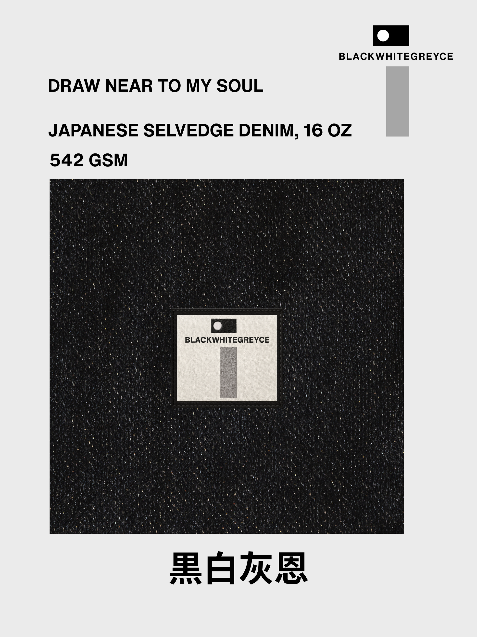 - Fabric: Japanese selvedge denim, 16 oz (542gsm), tightly woven for durability and architectural drape. Washed for a matte, structured hand-feel.